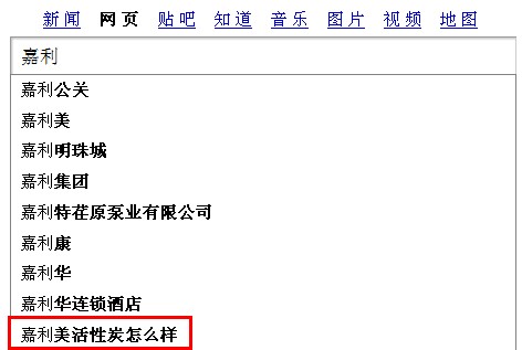 如下图,目前已经做不错推广的活性炭品牌搜索结果,我们可以利用人们常搜索的这些词来进行我们活性炭推广: