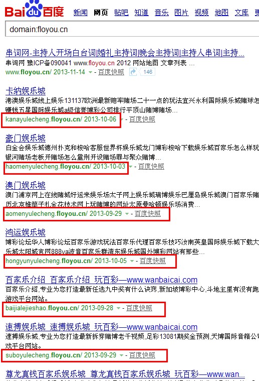 本人的串词网:www.chuanci.net 域名密码被盗,导致黑客进行了域名泛解析,并且有多达64万个博彩类二级域名如下图1所示,虽然现在域名被索回,但是这么多个博彩类二级域名已经被百度收录!(你说这百度,让它收它不收,不让它收,它却收全收,真贱!),并且有的还有了排名。