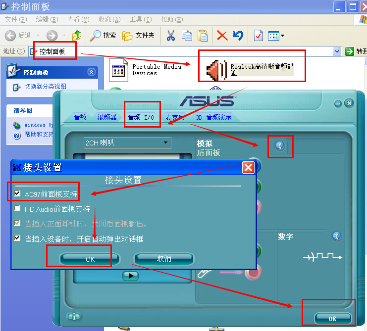4、点击上面的模拟后面的那个工具图标,在接头设置中选择“AC97前面支持”,OK.