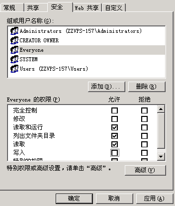 解决方法:在IIS中点击存放的网站文件夹,点击右击选择“安全”选项卡,添加“everyone”,给予一定的权限,如下图,问题解决!