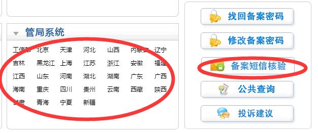 请先登录工信部域名信息备案管理系统http://www.miitbeian.gov.cn,选择进入您备案所在地的管局系统后,在页面上找到 备案短信核验,验证位置见下图红框处: