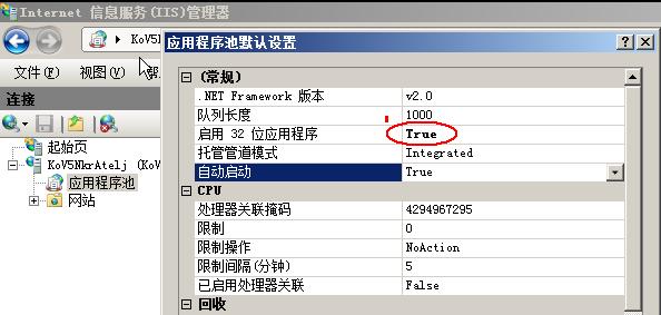IIS信息管理器 – ‘查看应用程序池’ – 右边操作中选择‘设置应用程序池默认设置..’,在‘常规’中设置‘启用 32 位程序’为True。