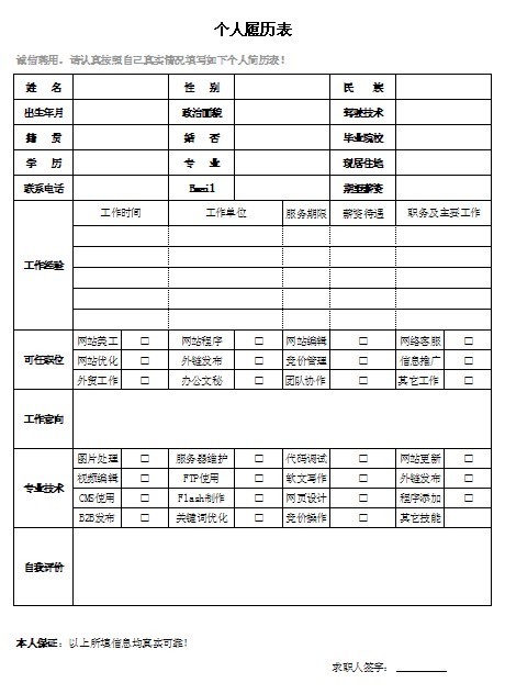 网络公司或电子商务部门在进行人员面试的时候最好是有个自己的表格,这样通过表格的填写就可以更多地知道待面试人员的基本情况,下面的个人履历空表适合优化公司、网络公司或电子商务部面试时填写使用,当然您也可以下载后根据自己的技能要求进行更改,希望阿权站长的面试履历空表能帮上您的忙: